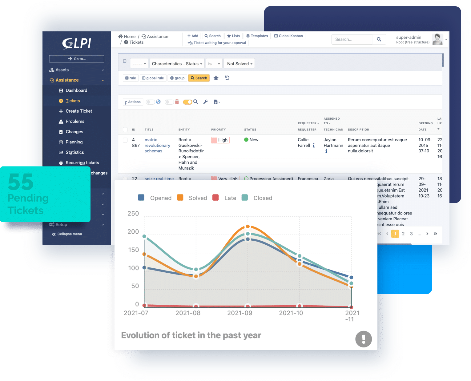 Organisez facilement votre support avec GLPI : gérez les incidents/demandes, créez des formulaires pour votre catalogue de services, définissez des SLA, offrez la meilleure expérience à vos clients.